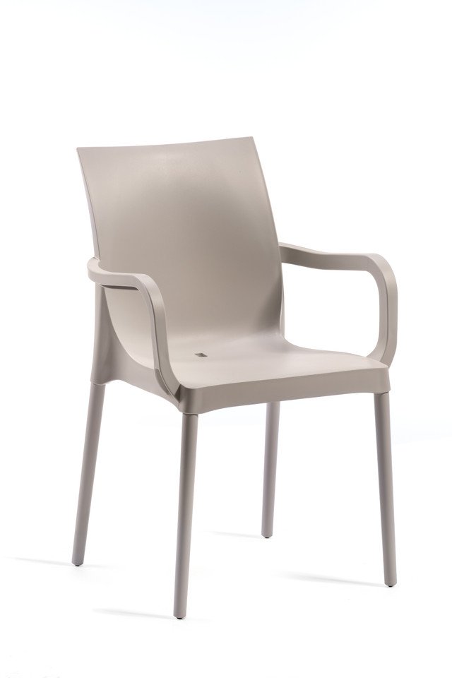 Cuerpo de la silla en tecnopolímero. Estructura de 4 patas metálica recubierta de tecnopolímero. Para uso interior y exterior. Apilable